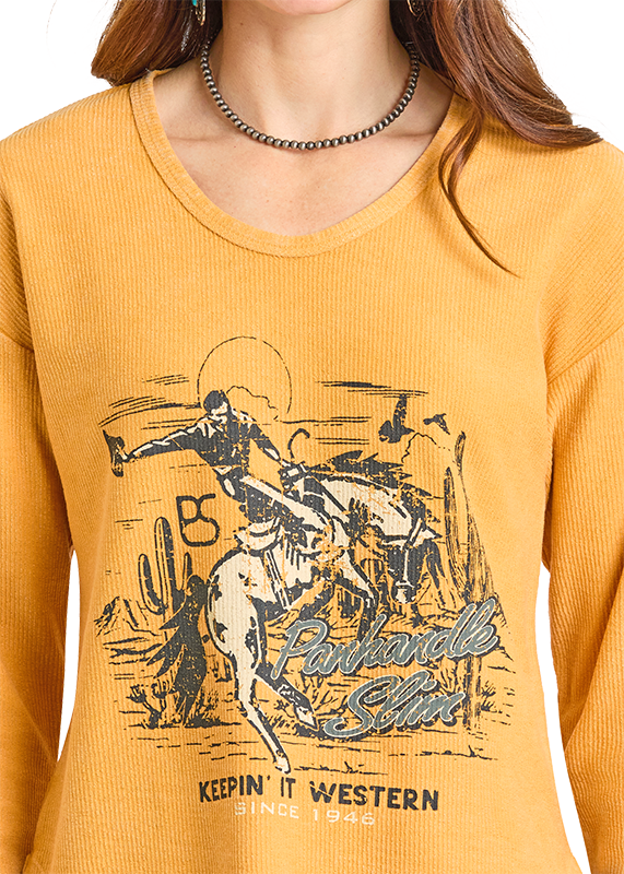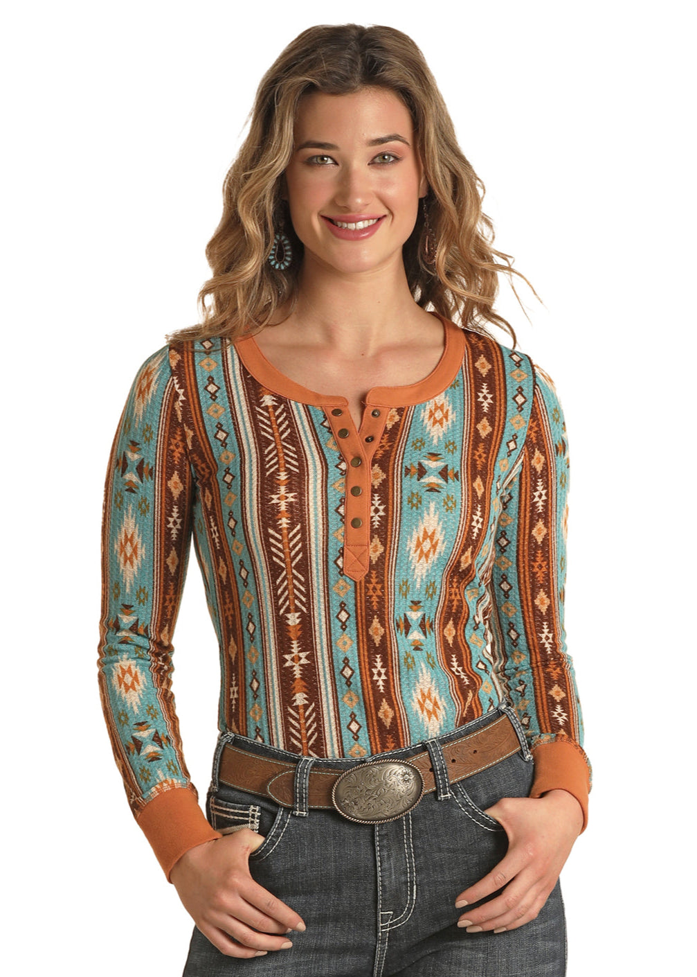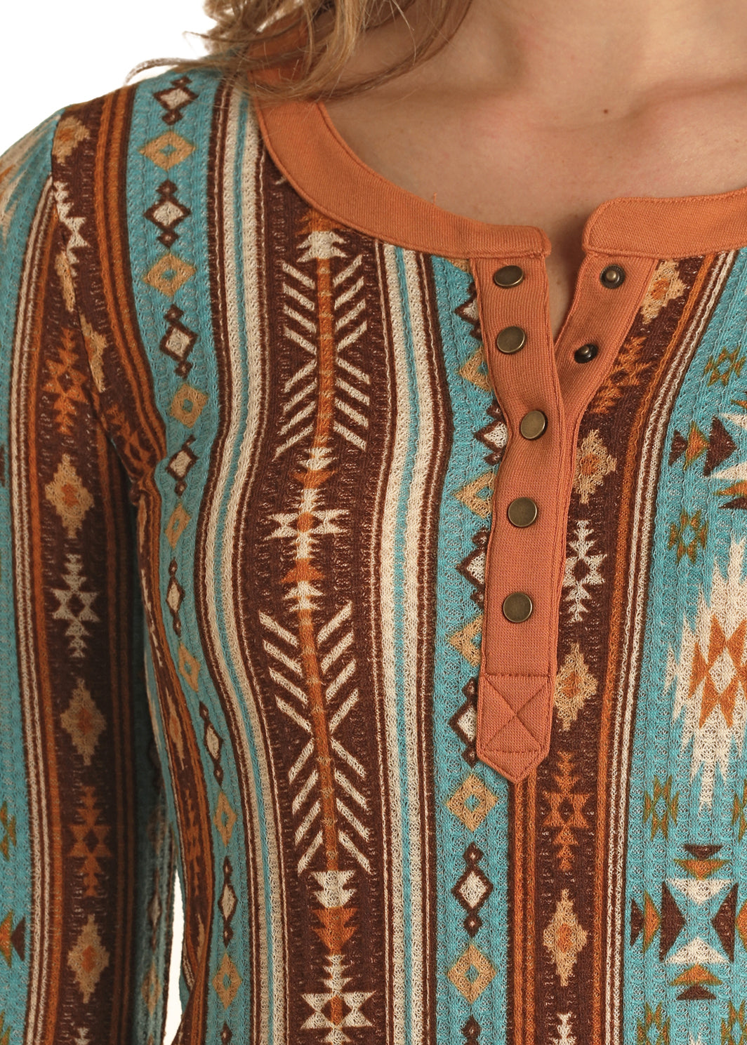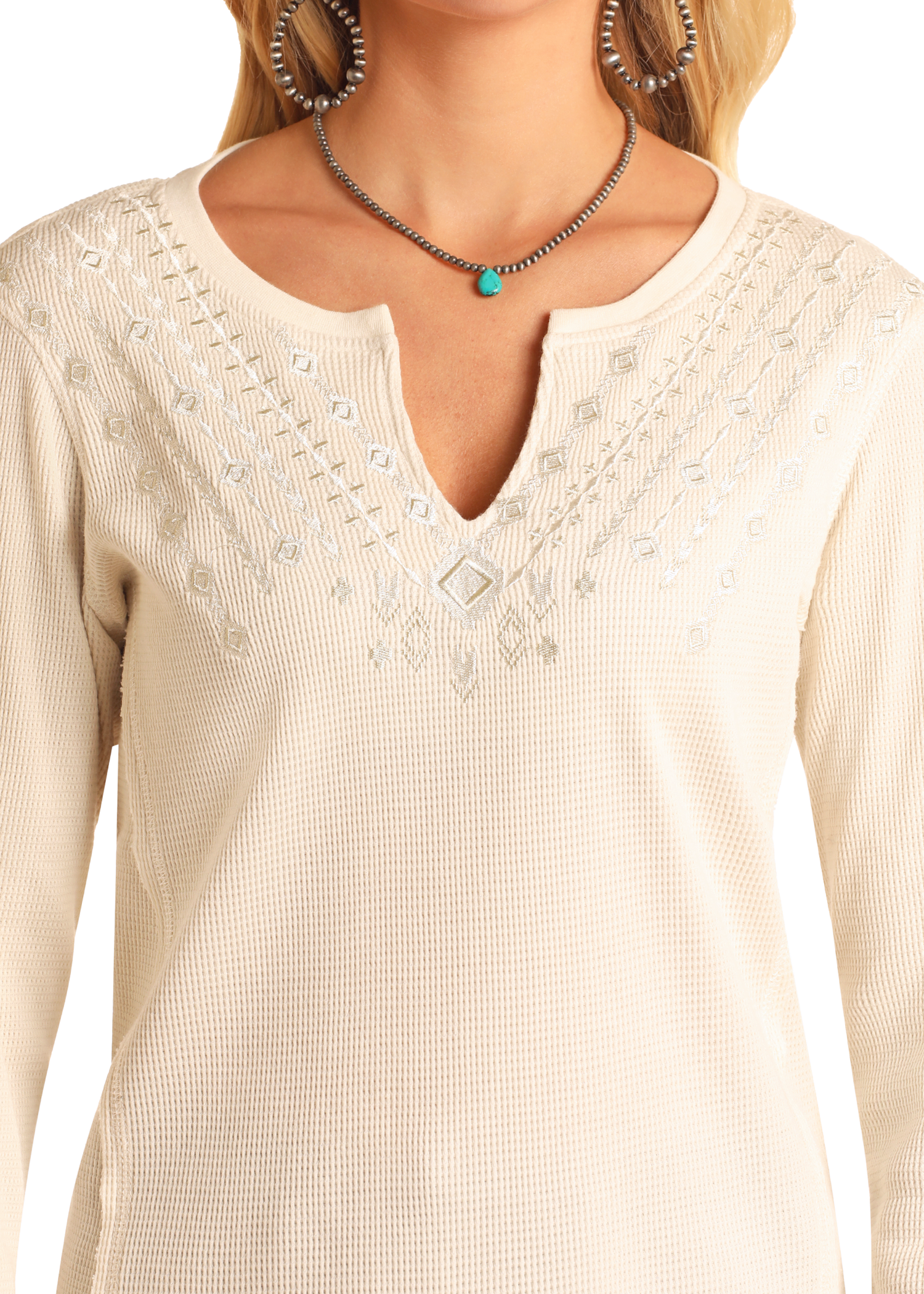 NewEmbroidered Notch Neck Long Sleeve Waffle Top