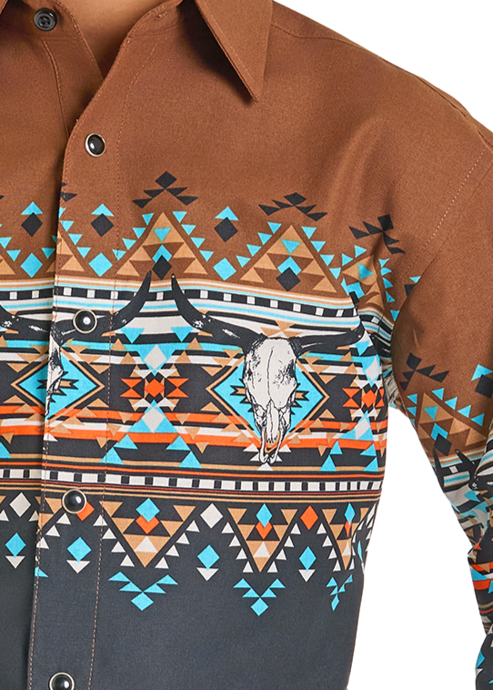 Boys' Brown Aztec Border Print Long Sleeve Snap Shirt