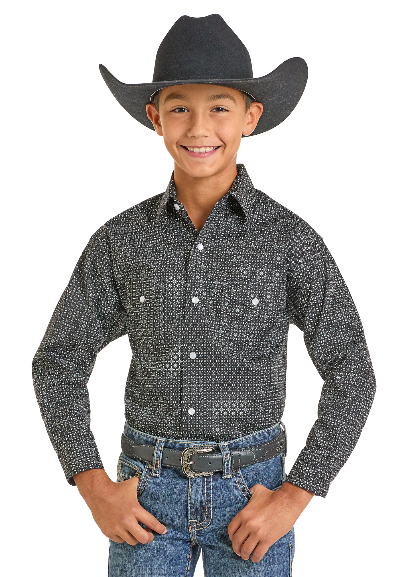 Boys' Rough Stock Black Geo Print Long Sleeve Snap Shirt