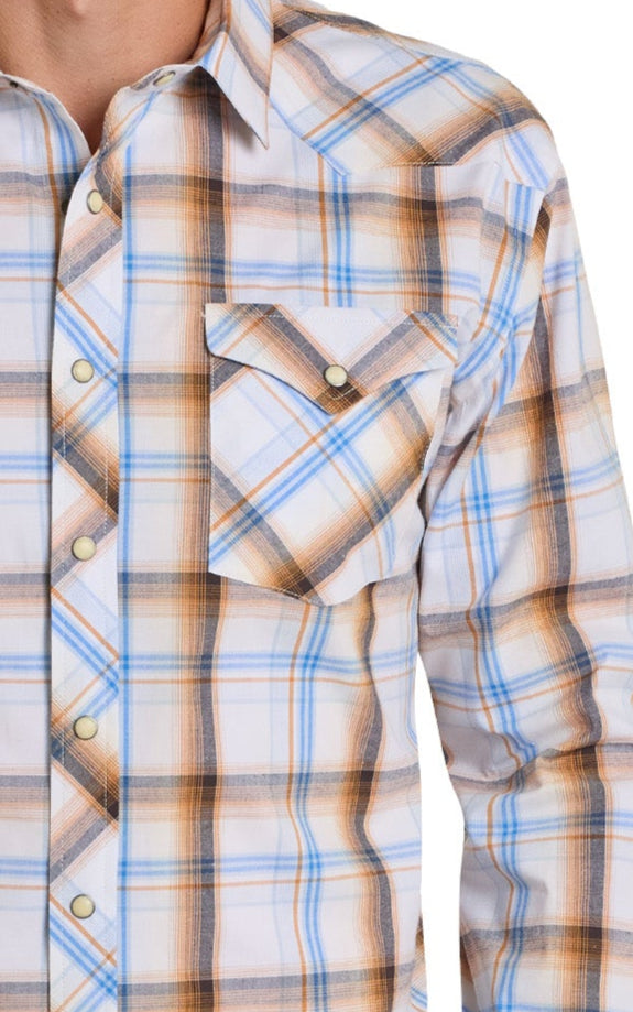 Modern Vintage Blue & Brown Plaid Long Sleeve Snap Shirt